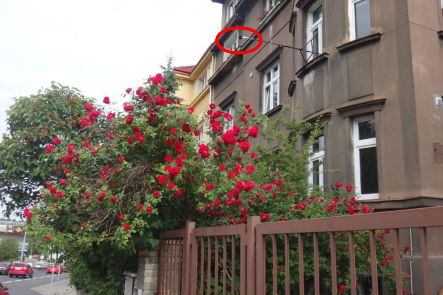 Mikrofon upevněn na stativu ve výšce 6,5 m nad terénem v úrovni oken obytných místností ve 3. NP, 2 m před fasádou, 7 m od osy nejbližšího jízdního pruhu ulice V Holešovičkách.